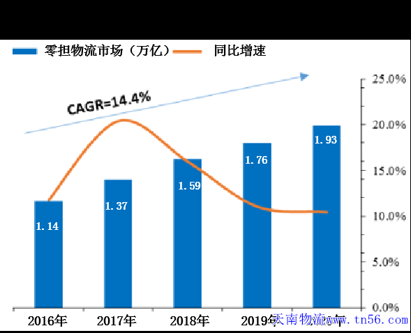 專家預測,到2020年,零擔物流(即專線物流)行業市場體量將達到近2萬億元。從2016年開始,整個市場都在以10%以上的速度在增長,發展前景十分廣闊。